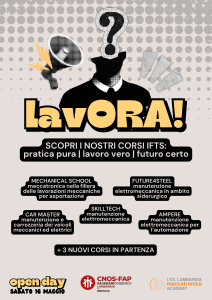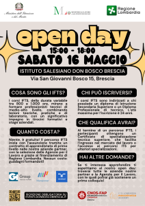 Scopri i nostri corsi IFTS e scegli il tuo futuro: sabato 16 maggio 2026, dalle 15 alle 18, ti aspettiamo all’Open Day dell’Istituto Salesiano Don Bosco di Brescia, un pomeriggio pensato per conoscere da vicino percorsi formativi concreti, gratuiti e fortemente collegati al mondo del lavoro.